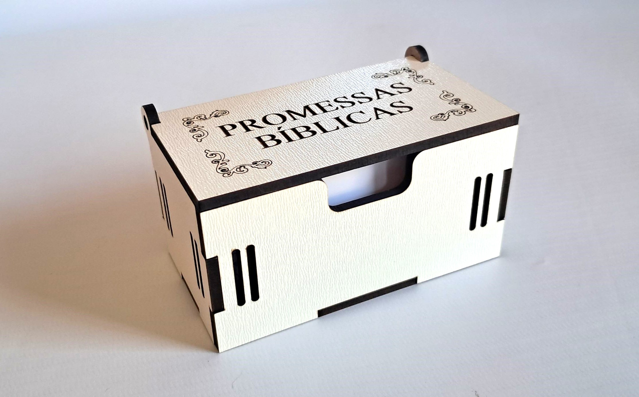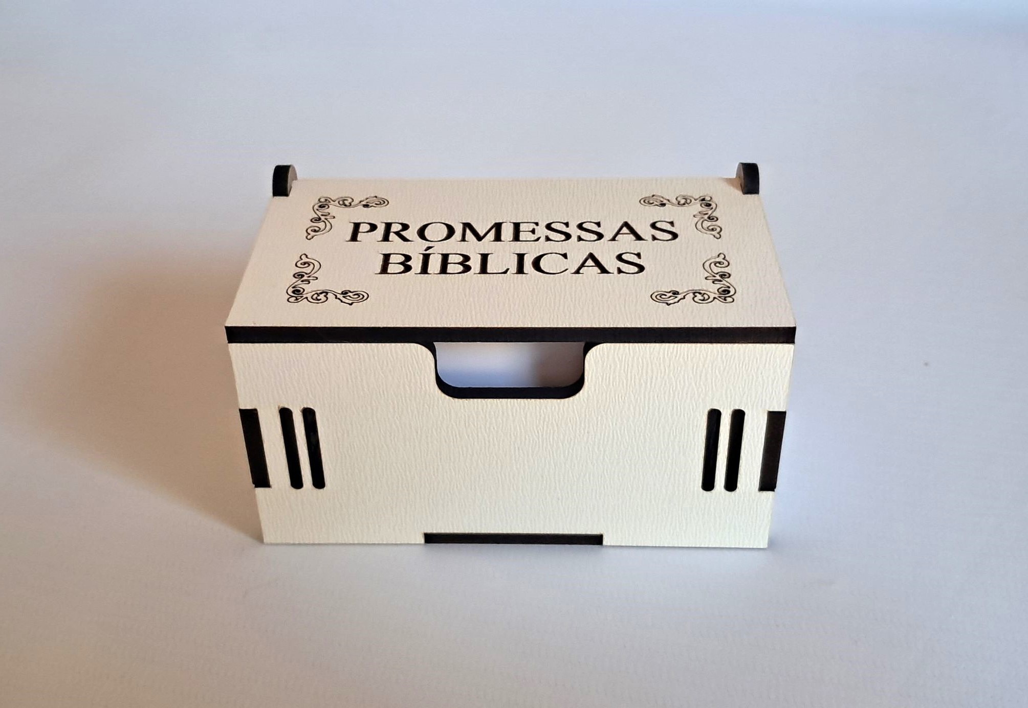 Produzida artesanalmente em MDF branco de 3mm, com gravação a laser, a caixa possui um estilo rústico e delicado ao mesmo tempo. Seu acabamento manual valoriza a simplicidade e o simbolismo espiritual, tornando-a também uma linda peça de decoração cristã para estantes, mesas ou pequenos altares.
